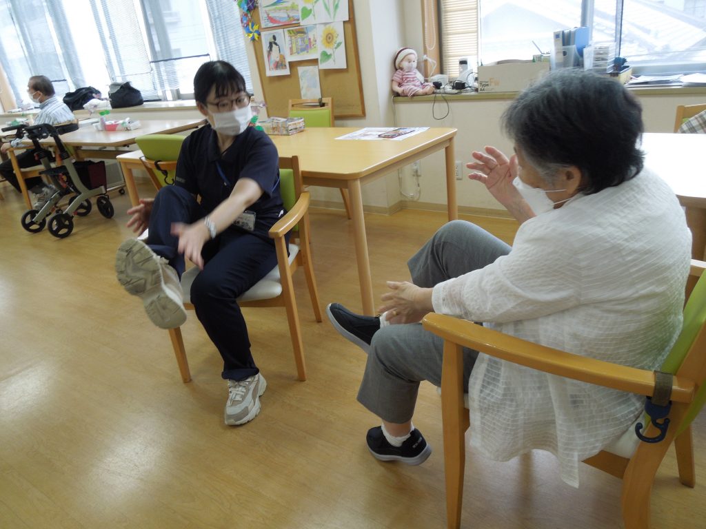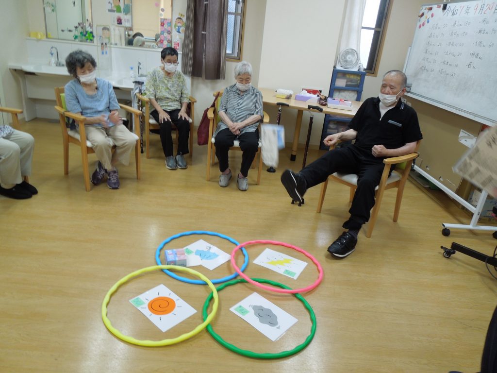 足を使ったスリッパ投げレクリエーション。全員で「あーした天気になあれ」と掛け声をかけ、えいや!と高得点の「晴れマーク」を狙ってスリッパを蹴り上げます。ストレスも発散されましたか?