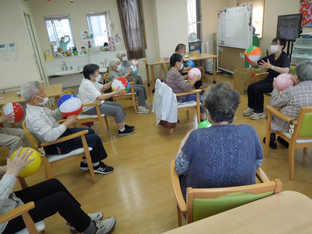 皆で楽しんで行えるボールを使ったエクササイズ。肩や腕、脇腹や腹筋を意識して、見た動作を再現する脳トレも兼ねています。